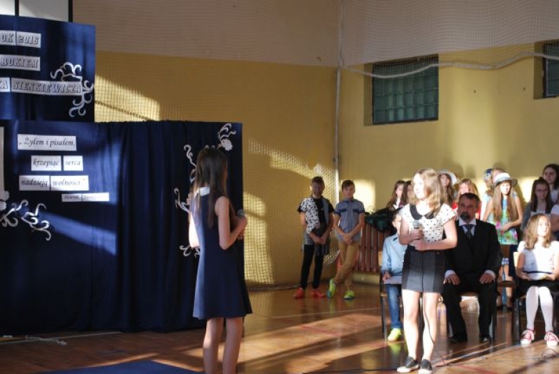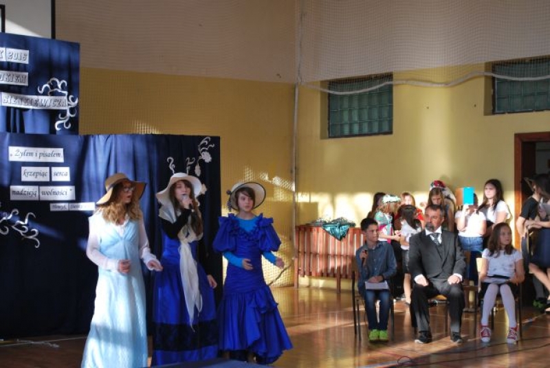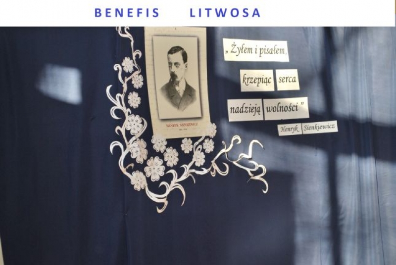 Pierwszym punktem programu tego dnia była część artystyczna zatytułowana ,,Benefis Litwosa”. Wystąpił w nim, jak go wszyscy nazywamy, nasz ,,współczesny” Henryk Sienkiewicz – pan Jacek Warzyński, który w tej roli jest po prostu niezastąpiony. Z właściwą sobie elegancją i jednocześnie swobodą przywitał się z publicznością oraz przybyłymi gośćmi, a szczególnie gorąco ze swoją prawnuczką Anną Dziewanowską. Wykazując się humorem i elokwencją odpowiadał na pytania uczniów prowadzących program: Pauliny Pasek i Karola Zaskórskiego. Jego wypowiedzi zostały urozmaicone inscenizacjami najciekawszych scen z utworów Sienkiewiczowskich: ,,W pustyni w puszczy”, ,,Janko Muzykant”, ,,Krzyżacy” oraz z przyjazdu pana Henryka do Żytna. W rolach głównych wystąpili uczniowie klas IV-VI: Janko Muzykant – Michał Bus, jego matka – Nikola Łęgowik, Zbyszko z Bogdańca – Maciek Flasza, Danusia Jurandówna – Amelia Falana, kat krzyżacki – Dawid Siwek, Staś Tarkowski – Filip Ciszewski, Nel Rawlison – Wiktoria Bus, Kali – Kacper Olak, młody Henryk Sienkiewicz – Kacper Nowakowski, Maria Gryf- Kellerówna – Martyna Sadziak, Helena Modrzejewska – Agata Błażejewska, Sachem – Paweł Piasecki, narratorzy: Aleksandra Janicka, Roksana Marciniak, Igor Kowalski.