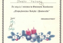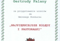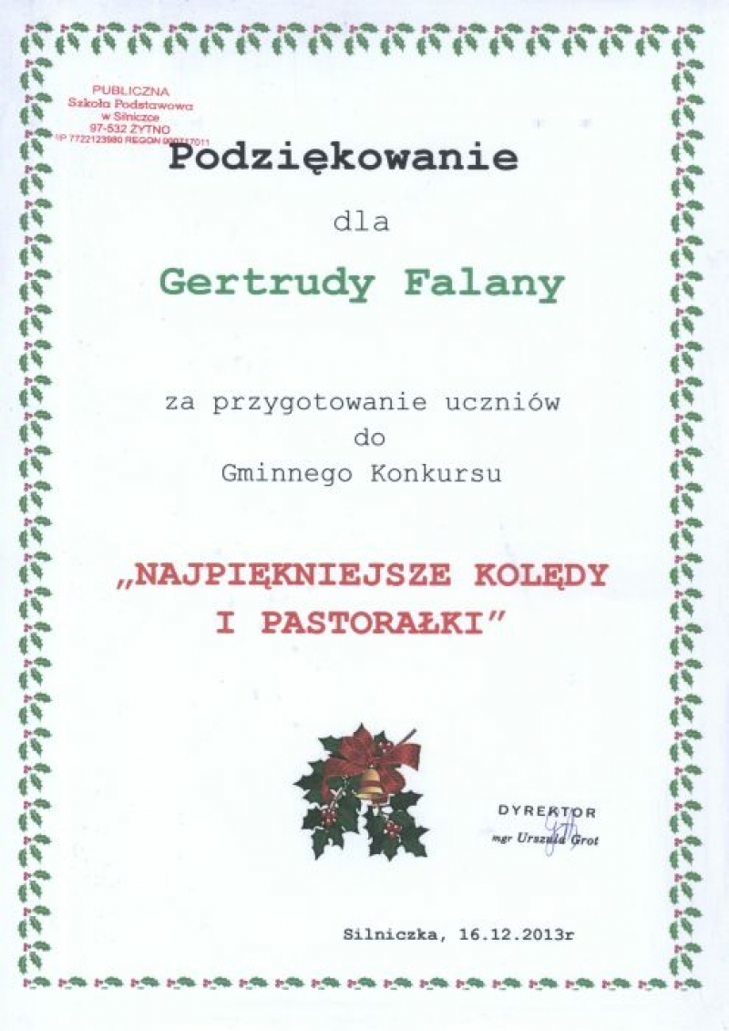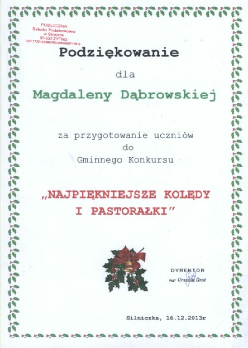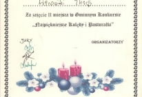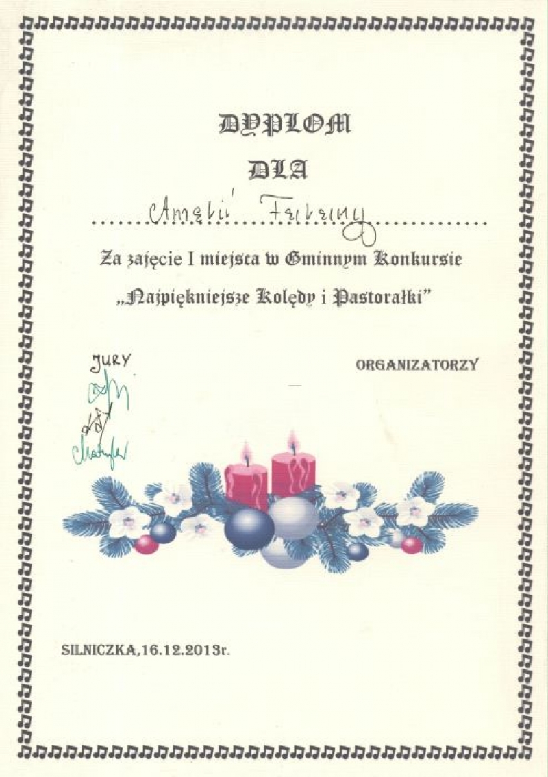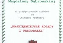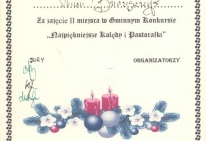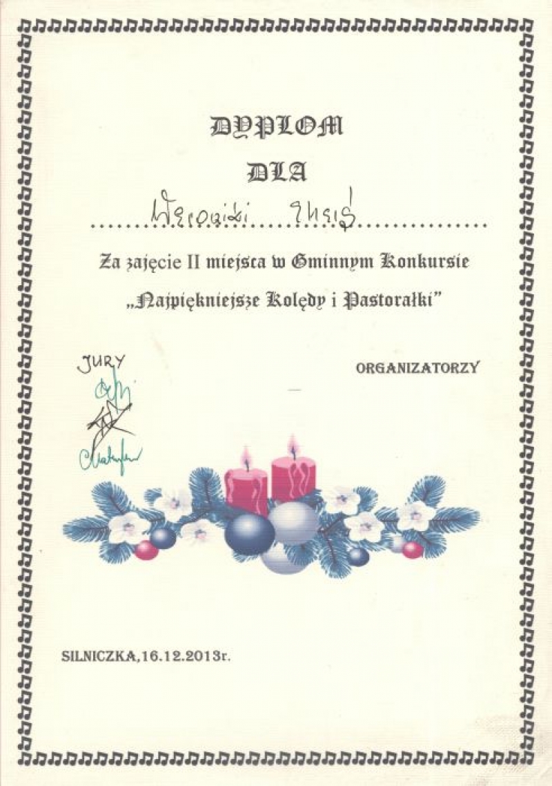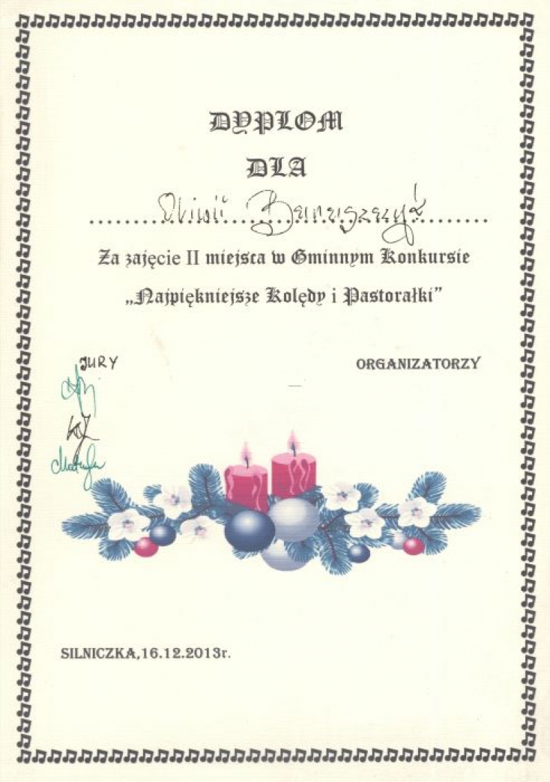 W dniu 16 grudnia 2013 roku uczennice naszej szkoły wzięły udział w Międzyszkolnym Konkursie Kolęd „Najpiękniejsze polskie kolędy” , który odbył się w Publicznej Szkole Podstawowej w Silniczce. Uczennice pięknie zaprezentowały się zarówno w tradycyjnych kolędach jak i nowych piosenkach o tematyce bożonarodzeniowej zajmując :