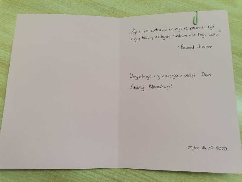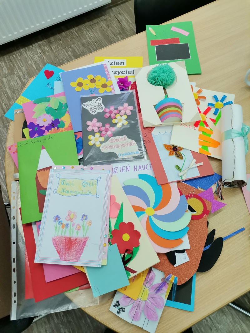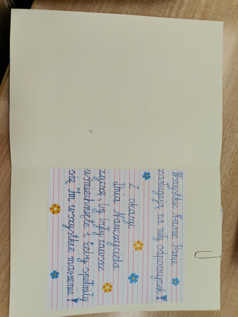 Z okazji Dnia Edukacji Narodowej Samorząd Uczniowski wraz z opiekunem p. Eweliną Kuś-Kręciwilk zorganizował konkurs na najpiękniejszą kartkę z życzeniami. Wiele pięknych konkursowych prac wpłynęło, a jury (człnkowie SU i p. Małgorzata Knop) miało "twardy orzech do zgryzienia" przy wyborze tych najpiękniejszych. Po długich obradach uzgodniono, iż w kategorii: