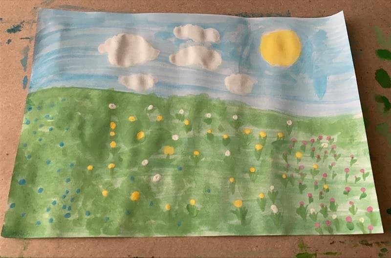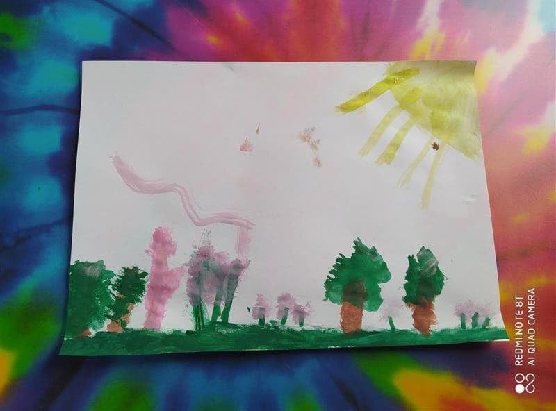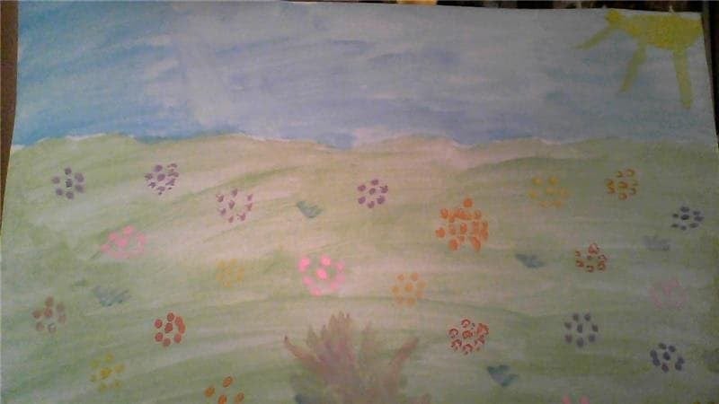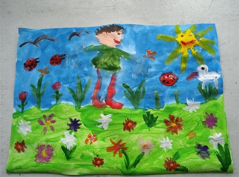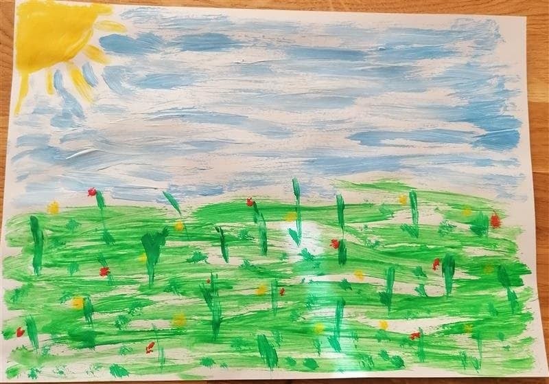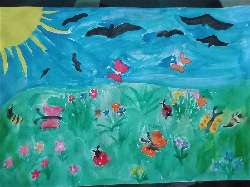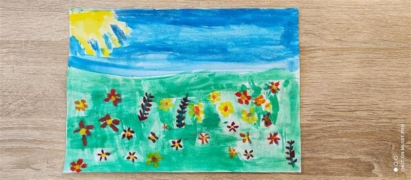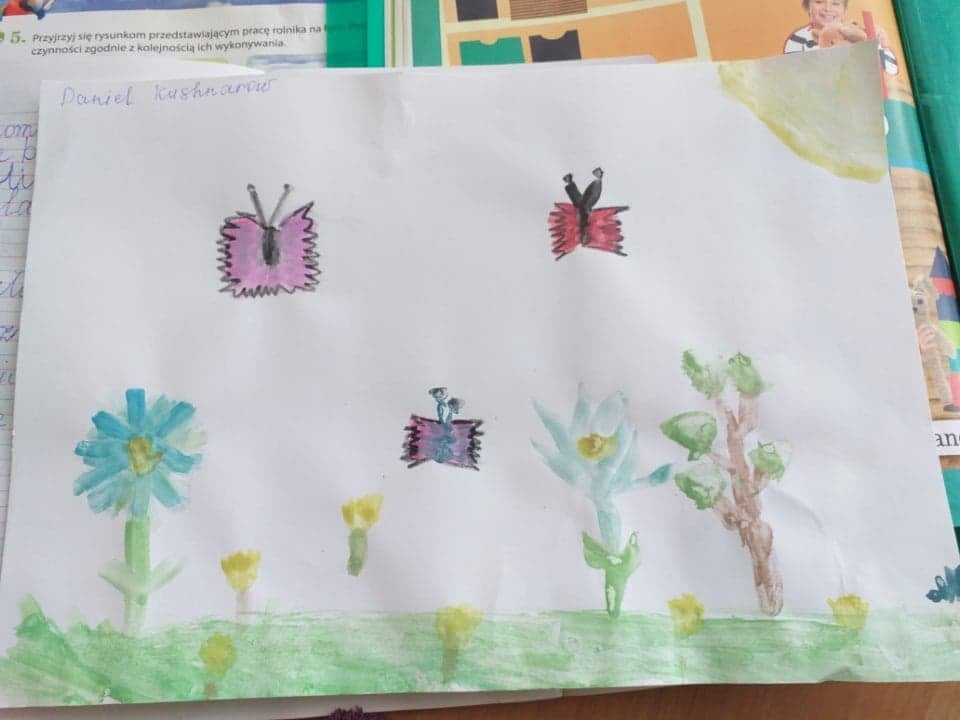 Łąka wiosną pełna jest zieleni, owady i rośliny budzą się do życia. Oto wiosna w oczach i na pracach pierwszoklasistów.