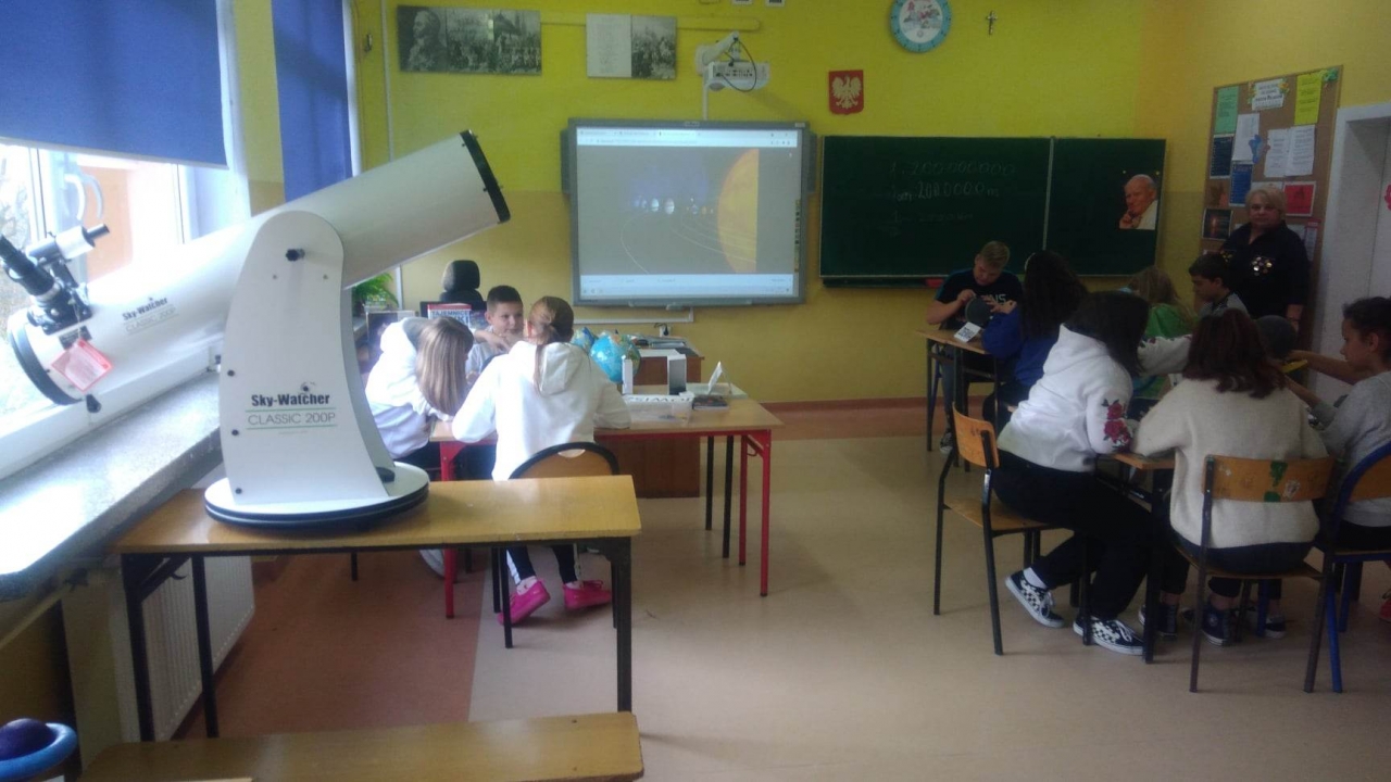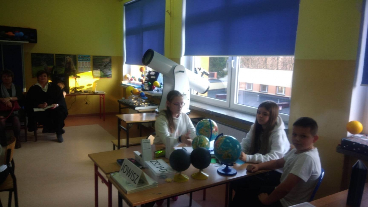 22 listopada 2022r. mieliśmy okazję uczestniczyć w niezwykłym wydarzeniu, którego bohaterami byli uczniowie klasy VI a, a inicjatorką pani Małgorzata Bus – nauczycielka matematyki i geografii . Owym wydarzeniem była lekcja otwarta, na której gościli niemal wszyscy nauczyciele naszej szkoły. Jej celem było nie tylko utrwalenie wiadomości z zakresu Układu Słonecznego i ruchów Ziemi, ale także zademonstrowanie różnych sposobów wykorzystania do celów edukacyjnych pomocy otrzymanych przez szkołę w ramach programu ,,Laboratoria Przyszłości”. Zajęcia prowadzone były w sposób bardzo atrakcyjny dla uczniów, którzy weszli w rolę młodych odkrywców. Obiektami ich badań były przede wszystkim planety: Jowisz, Saturn , Ziemia ,a narzędziami badawczym i pomocami naukowymi: teleskop Sky – Watcher -Classic 200 P, długopisy 3 D, drukarka 3 D oraz program do projektowania modeli Tinkercad , w którym uczniowie wykonali model Saturna w odpowiedniej skali. Młodzi odkrywcy doskonale wywiązali się ze swoich zadań, odbywając wyimaginowaną podróż w kosmos i chwilowo zapominając, iż siedzą tylko przy ławce szkolnej.