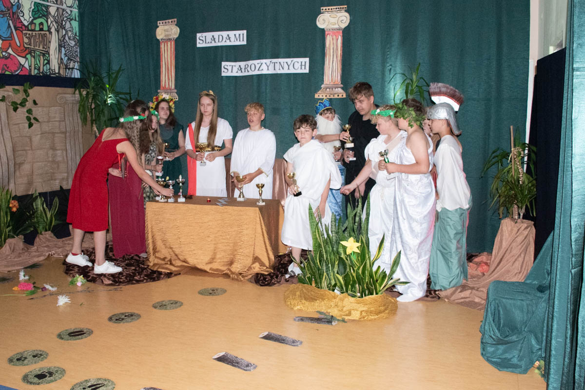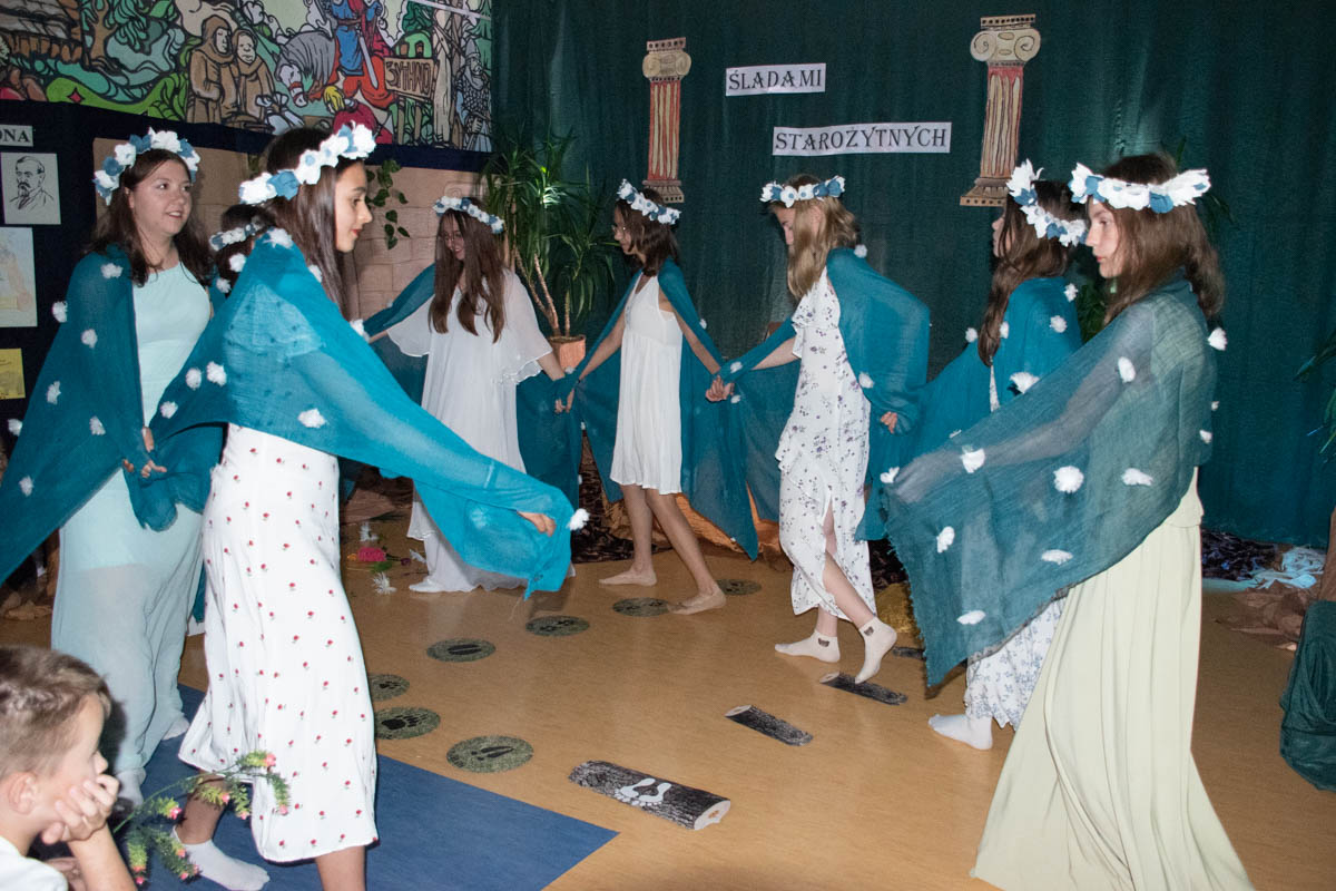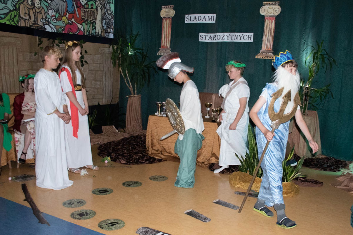 Uczniowie doskonale wcielili się w role mitologicznych bogów i bohaterów. Zaprezentowali olimpijską ucztę, w której wzięły udział wszystkie najdostojniejsze bóstwa, a następnie przybliżyli publiczności historię przebiegłego Syzyfa, kochającego do granic możliwości Orfeusza, a także mit o Demeter i Korze.