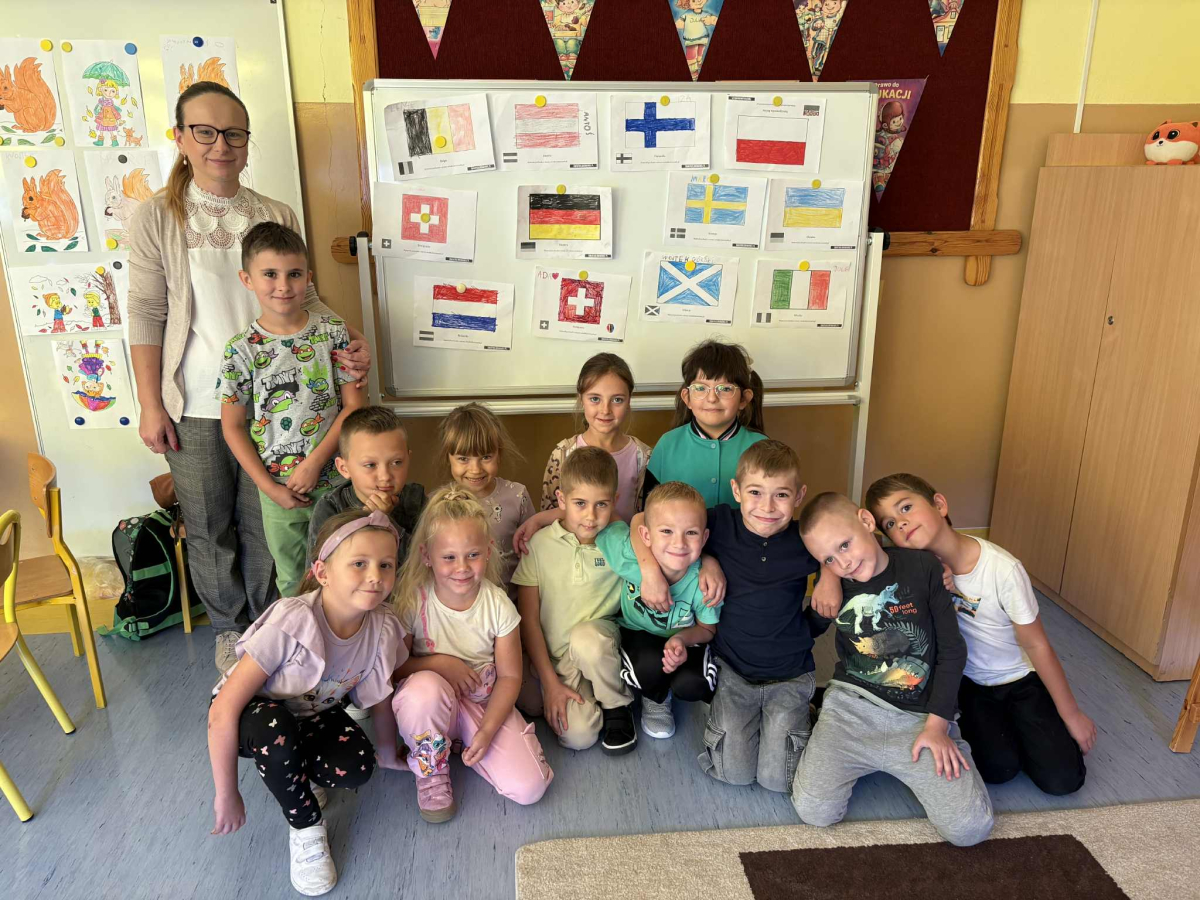 Uczniowie klas 1-3 podczas zajęć dowiedzieli się, co kryje się pod hasłem Europa, rozpoznawali flagi krajów europejskich oraz stworzyli wystawę swoich prac.