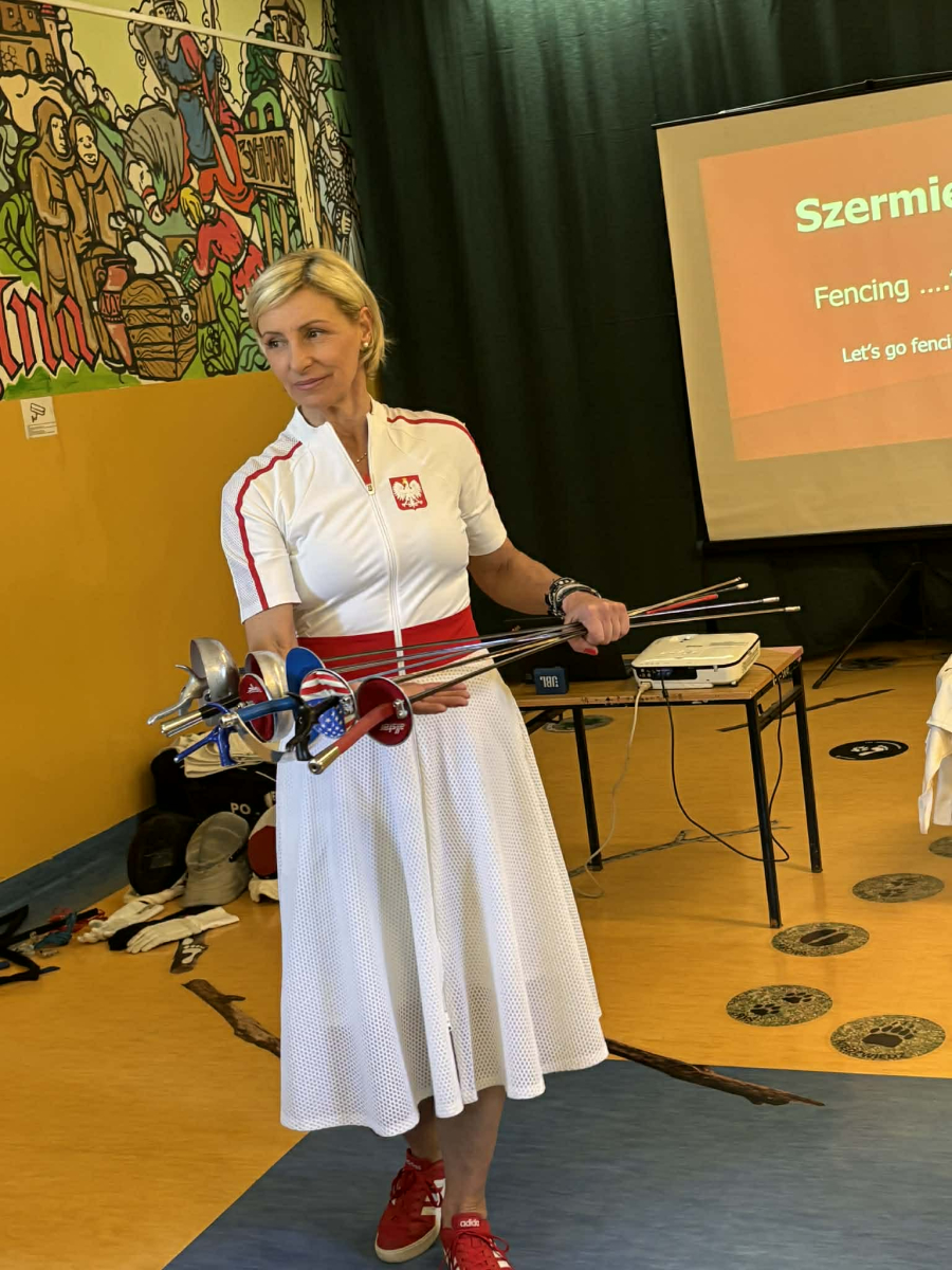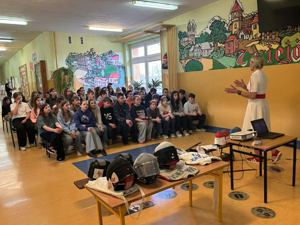 Cóż to był za finał tygodnia! W piątkowe południe odwiedził naszą szkołę niezwykły gość. Była nim absolwentka Akademii Wychowania Fizycznego w Warszawie, polska florecistka i szpadzistka – wielokrotna mistrzyni Polski w szermierce – pani Monika Maciejewska. Jej sukcesy odbiły się dużym echem także poza granicami naszego kraju, bowiem pani Monika czterokrotnie zdobyła brązowy medal na Mistrzostwach Europy, a także osiągnęła satysfakcjonujące wyniki podczas Igrzysk Olimpijskich w Barcelonie.