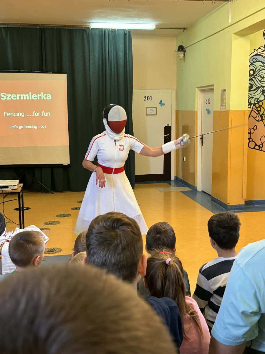 Zwieńczeniem zajęć były warsztaty dla uczniów, podczas których mogli spróbować swoich sił w tej dyscyplinie sportowej. Okazało się, że pani Monika z imponującą prędkością potrafi zarażać swoją pasją! Świadczyły o tym kolejki uczniów ustawiających się do prowadzonego przez nią treningu. Uczniowie ze skupieniem przyjmowali wszystkie wskazówki szpadzistki, a następnie próbowali swoich sił w szermierce. Ich zaangażowanie, postawa oraz ubiór, o który oczywiście zadbał nasz gość, robiły niemałe wrażenie. Kto wie? Może kryją się wśród nich jacyś przyszli szpadziści, którzy śladami naszej mistrzyni zawędrują na podium?